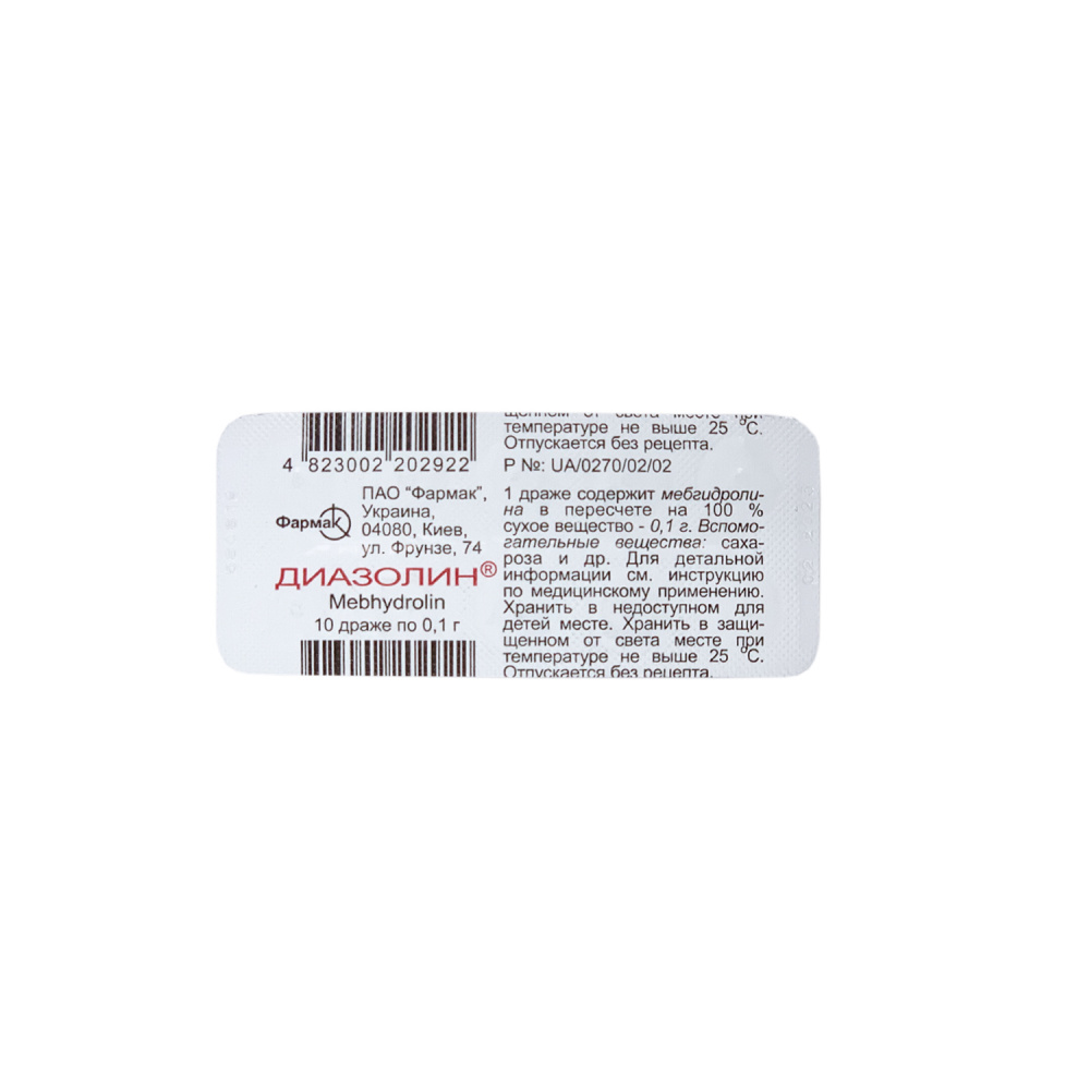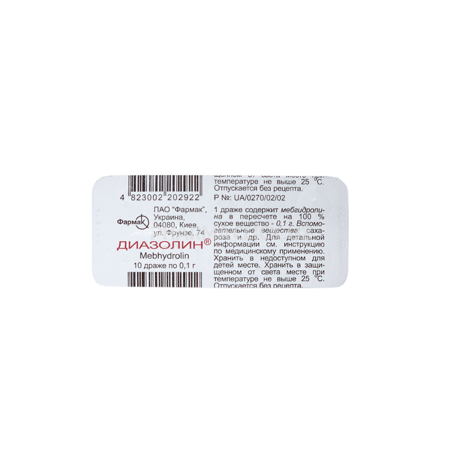 Со стороны пищеварительной системы Диазолин может раздражать слизистые оболочки желудочно-кишечного тракта, что иногда проявляется диспептическими явлениями (изжога, тошнота, боль в эпигастральной области). Со стороны центральной нервной системы головокружение, парестезии, повышенная утомляемость, сонливость, нечеткость зрительного восприятия, замедление скорости реакций, тремор, тревожность (ночью). Другие сухость во рту, нарушения мочеиспускания, аллергические реакции. Крайне редко возможно возникновение гранулоцитопении и агранулоцитоза. У детей иногда наблюдаются парадоксальные реакции повышенная возбудимость, тремор, нарушения сна, раздражительность. В единичных случаях в пострегистрационном периоде отмечались следующие побочные реакции головная боль, зуд, высыпания, крапивница, отек Квинке.