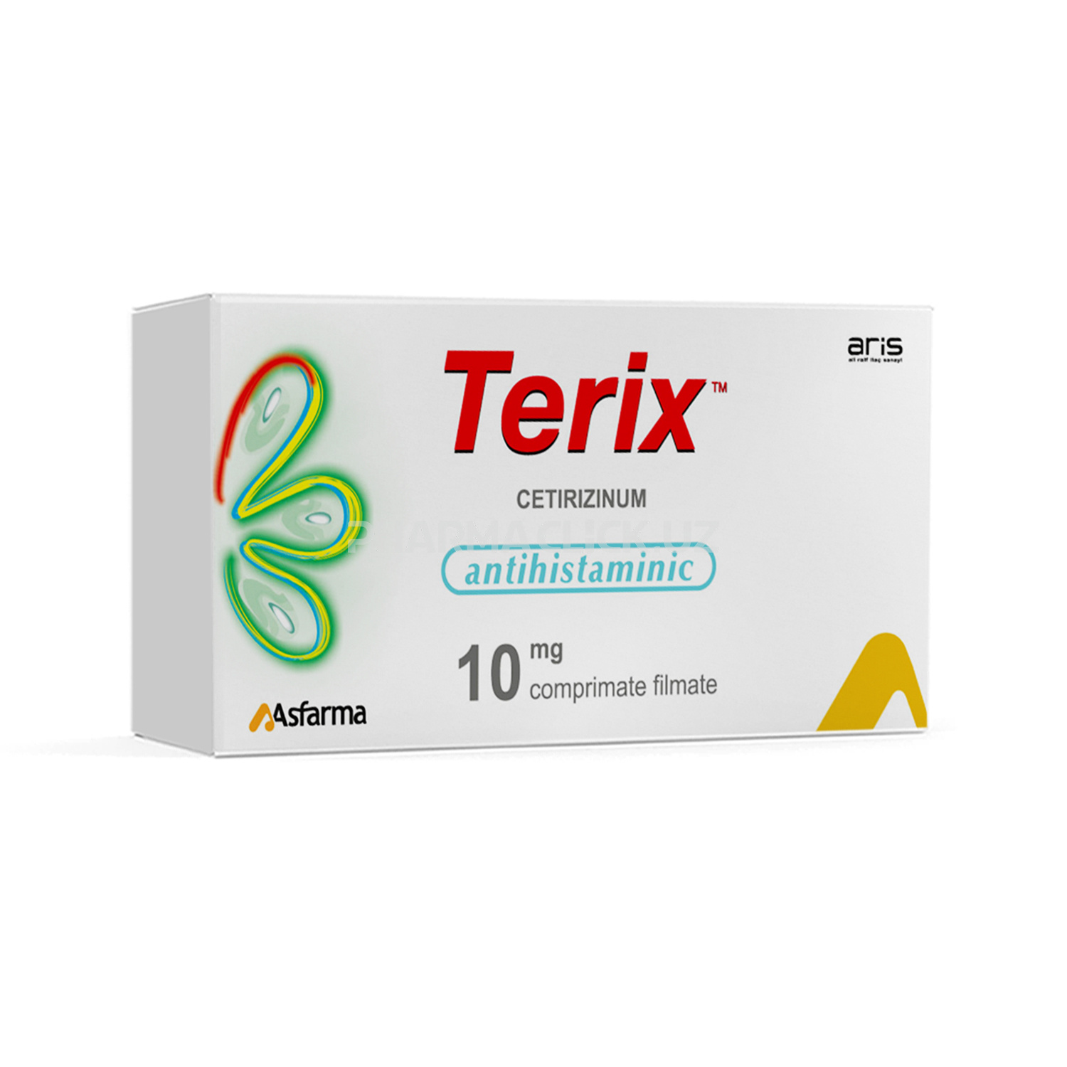 Активный компонент Терикса - цетиризин - является селективным антагонистом Н1-гистаминовых рецепторов. В средних терапевтических дозах не проходит через гематоэнцефалический барьер. Только в высоких дозах или в редких случаях может дать небольшой седативный эффект. Терикс также in vivo ингибирует эндогенные гистаминовые рецепторы. Препарат предупреждает кожные реакции, причинами которых являются вазоактивные интестинальные полипептиды (VIP) и Р-вещества. Цетиризин снижает гиперреактивность бронхов к гистамину у больных бронхиальной астмой. Этим же способом снижает специфические аллергические реакции.