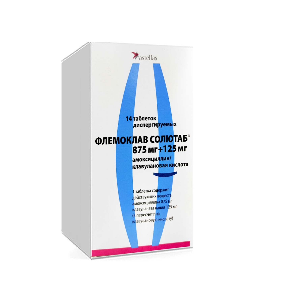 После однократного приема Флемоклава Солютаб® в дозе 875 мг + 125 мг (амоксициллин + клавулановая кислота) Cmax амоксициллина в плазме крови создается через 1,5 ч и составляет 12 мкг/мл, клавулановой кислоты — через 1 ч, составляя 3 мкг/мл. AUC амоксициллина и клавулановой кислоты — 33 мкг·ч/л и 6 мкг·ч/л соответственно. Абсорбция амоксициллина при пероральном применении достигает 90%, абсолютная биодоступность клавулановой кислоты составляет в среднем 60%. Приблизительно 17–20% амоксициллина и 22% клавулановой кислоты связывается с белками плазмы крови. Общий Cl для двух активных субстанций составляет 25 л/ч, T1/2 амоксициллина — 1,1 ч, клавулановой кислоты — 0,9 ч. Приблизительно 60–80% амоксициллина и 30–50% клавулановой кислоты выводится через почки в течение первых 6 ч после приема препарата. Амоксициллин выводится преимущественно в неизмененном виде, небольшая часть метаболизируется путем гидролиза бета-лактамного кольца до неактивных метаболитов (основные — пеницилловая и пенамальдовая кислоты). Клавулановая кислота подвергается интенсивному метаболизму путем гидролиза и последующего декарбоксилирования.