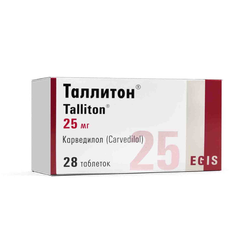 карведилол 6,25 мг, 12,5 мг или 25 мг карведилола в каждой таблетке соответственно. Вспомогательные вещества лактозы моногидрат, кросповидон, сахароза, кремния диоксид коллоидный безводный, повидон К-25, магния стеарат. Кроме указанных выше компонентов, таблетки Таллитон 6,25 мг содержат хинолиновый жёлтый С.I. 47005, а таблетки Таллитон 12,5 мг содержат сансет жёлтый С.I. 15985 в качестве красителя.