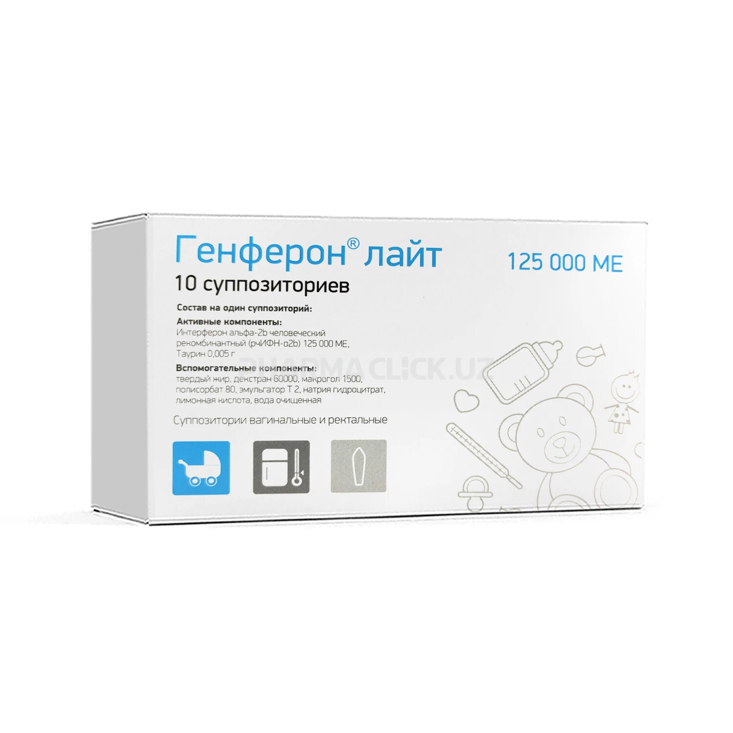 , доза и длительность курса зависят от возраста и конкретной клинической ситуации. У взрослых и детей старше 7 лет Генферон® Лайт применяют в дозе 250 000 МЕ интерферона альфа-2b на суппозиторий. У детей до 7 лет, включая детей грудного возраста, безопасным является применение препарата в дозе 125 000 МЕ интерферона альфа-2b на суппозиторий. У женщин, находящихся на 13-40 неделе беременности, препарат применяется в дозе 250 000 МЕ интерферона альфа-2b на суппозиторий. Рекомендуемые дозы и режимы лечения ● Острые респираторные вирусные инфекции и другие острые заболевания вирусной природы у детей по 1 суппозиторию ректально 2 раза в день с 12-часовым интервалом параллельно основной терапии в течение 5 дней. Если по истечении 5-дневного срока лечения симптомы заболевания не уменьшаются или становятся более выраженными, пациенту следует обратиться к врачу. По клиническим показаниям возможен повтор курса лечения после 5-дневного интервала. ● Хронические инфекционно-воспалительные заболевания вирусной этиологии у детей старше 7 лет по 1 суппозиторию (250 000 МЕ) ректально 2 раза в день с 12-часовым интервалом параллельно стандартной терапии в течение 10 дней. Затем в течение 1-3 месяцев – по 1 суппозиторию ректально на ночь через день. ● Острые инфекционно-воспалительные заболевания урогенитального тракта у детей по 1 суппозиторию ректально 2 раза в день с 12-часовым интервалом в течение 10 дней на фоне назначаемой и контролируемой врачом специфической терапии. ● Инфекционно-воспалительные заболевания урогенитального тракта у беременных по 1 суппозиторию (250 000 МЕ) вагинально 2 раза в день с 12-часовым интервалом в течение 10 дней на фоне назначаемой и контролируемой врачом специфической терапии. ● Инфекционно-воспалительные заболевания урогенитального тракта у женщин по 1 суппозиторию (250 000 МЕ) вагинально или ректально (в зависимости от характера заболевания) 2 раза в день с 12-часовым интервалом в течение 10 дней на фоне назначаемой и контролируемой врачом специфической терапии. При затяжных формах 3 раза в неделю через день по 1 суппозиторию в течение 1-3 месяцев.