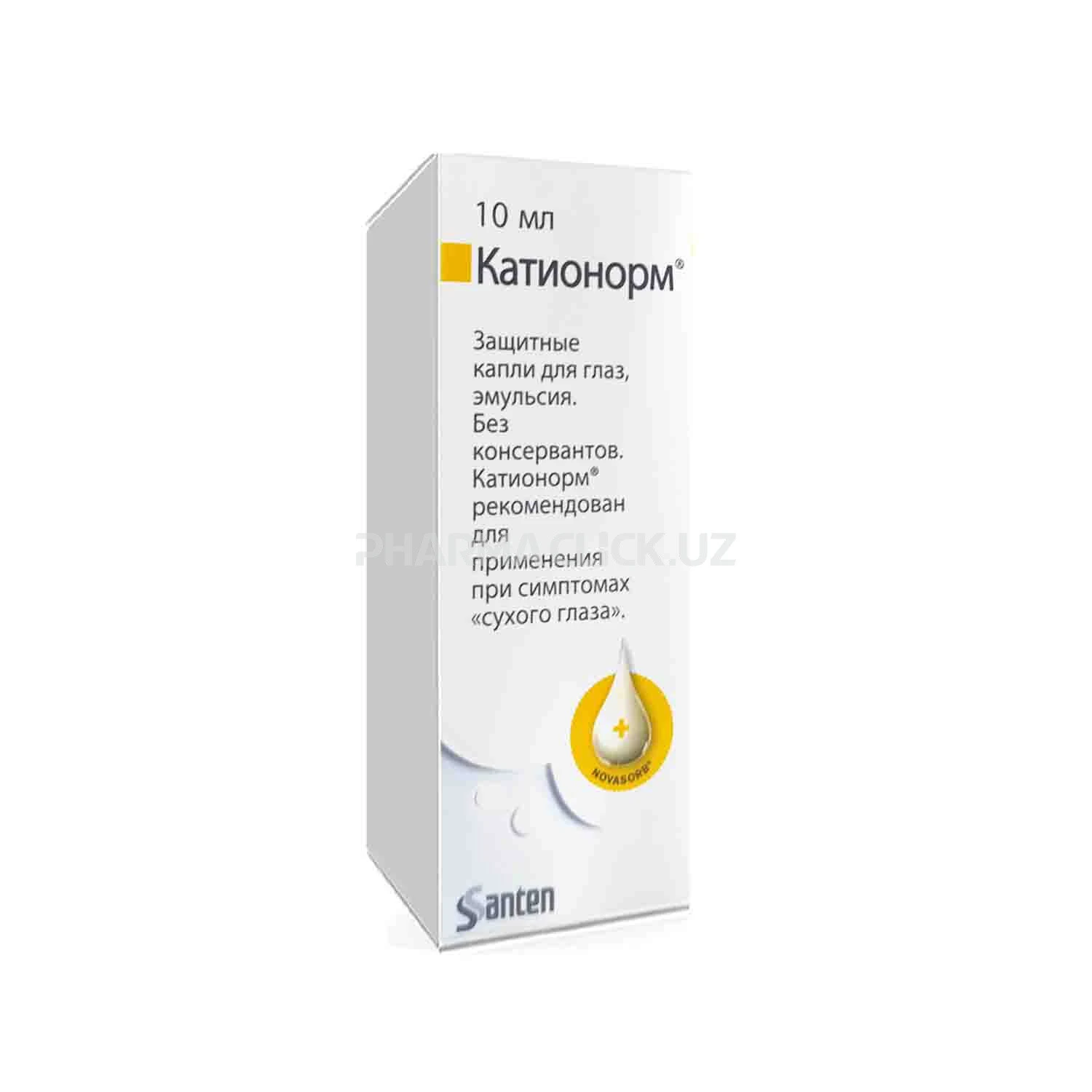 Катионорм представляет собой глазную гипотоническую эмульсию (рн 5.0-7.5) в виде жидкости молочного цвета, не содержащую консервантов. Капли глазные Катионорм рекомендуются для устранения и облегчения симптомов «синдрома сухого глаза», проявляющихся в виде покалывания, жжения, зуда, чувстве инородного тела (ощущение песка или пыли в глазах). Данные симптомы могут быть связаны с внешними факторами (кондиционирование воздуха, ветер, загрязнение, дым, пыль, путешествие на самолете и т.д.) или интенсивной зрительной нагрузкой (например, длительной работой за компьютером).
