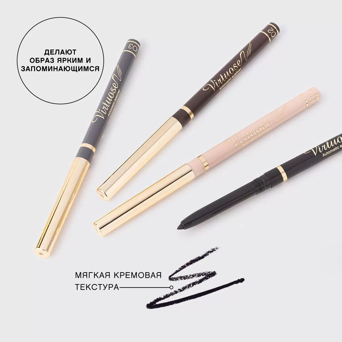 Твой макияж такой выразительный! С новыми Virtuose Automatique! Ультрамодные автоматические карандаши для глаз в 4 универсальных оттенках идеально подойдут для создания любого макияжа, эффектно подчеркнут взгляд, сделают образ ярким и запоминающимся. Они стойко держатся на веках, легко растушевываются и не отпечатываются на коже. Уверены, ты никогда не пожалеешь, что они есть в твоей косметичке!