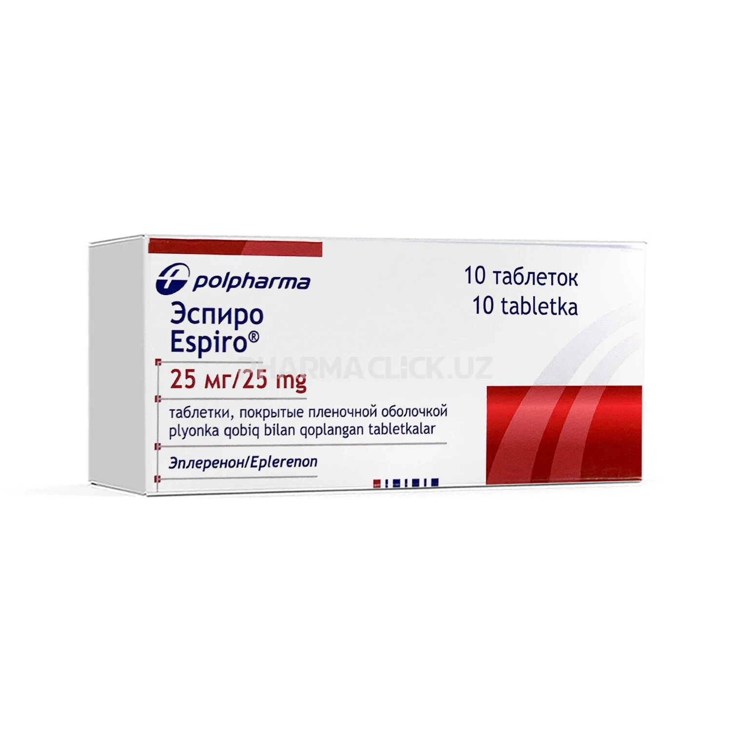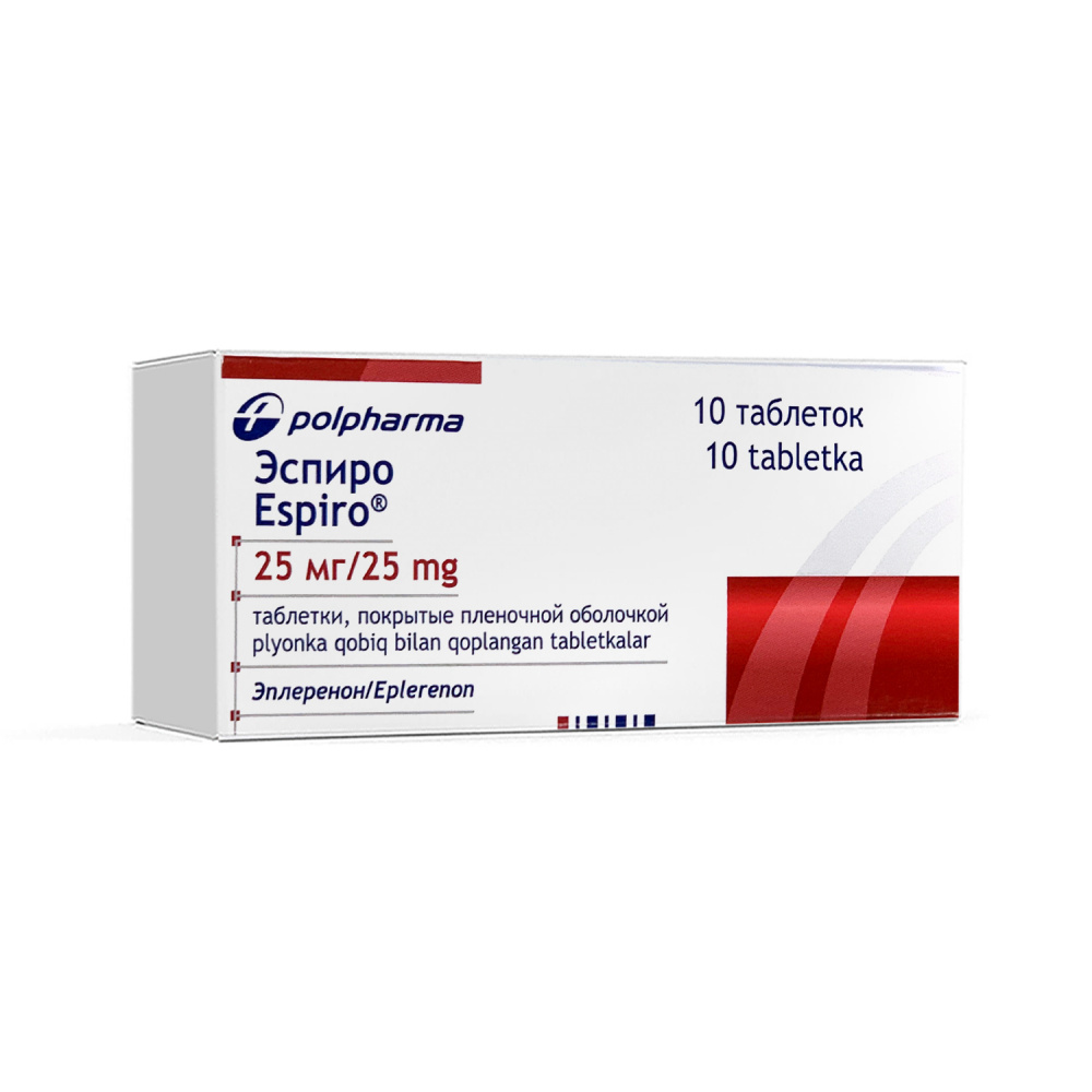 Эспиро 25 мг таблетка, покрытая пленочной оболочкой, содержит 25 мг эплеренона. Эспиро 50 мг таблетка, покрытая пленочной оболочкой, содержит 50 мг эплеренона. Вспомогательное вещества Ядро таблетки лактозы моногидрат, целлюлоза микрокристаллическая, натриевая соль кроскармеллозы, гипромеллоза 15cP, магния стеарат, натрия лаурилсульфат Oболочка таблетки гипромеллоза 6cP, макрогол 3350, титана диоксид (E 171), лактозы моногидрат, триацетин, железа оксид желтый (E 172)