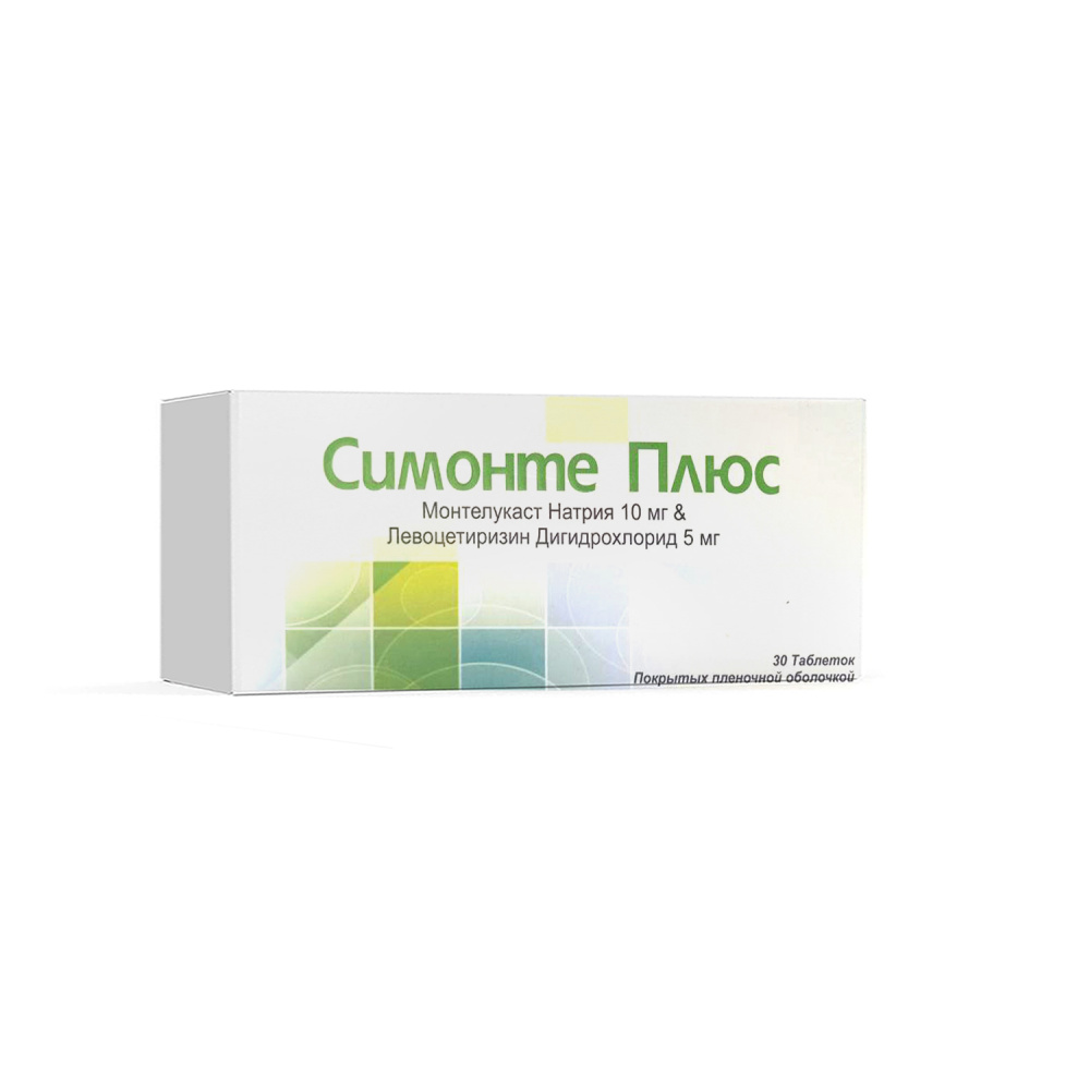 Симонте Плюс - комбинированный антиаллергический препарат монтелукаста натрия и левоцетиризина. Натрия монтелукаст является селективным и перорально активным антагонистом лейкотриеновых рецепторов, ингибирует цистеиниловые лейкотриеновые (CysLT1), рецепторы. Левоцетиризин является R-энантиомером цетиризина. Левоцетиризин является перорально активным, мощным, селективным и длительно действующим антагонистом H1-гистаминовых рецепторов без антихолинергической активности. Недавние исследования показали, что аллергический ринит [AR] при одновременном лечении с антилейкотриеновым (монтелукаст) и антигистаминным (левоцетиризин) препаратом проявляет значительно более быстрое облегчение симптомов, по сравнению с умеренным улучшением симптомов ринита при раздельном лечении.