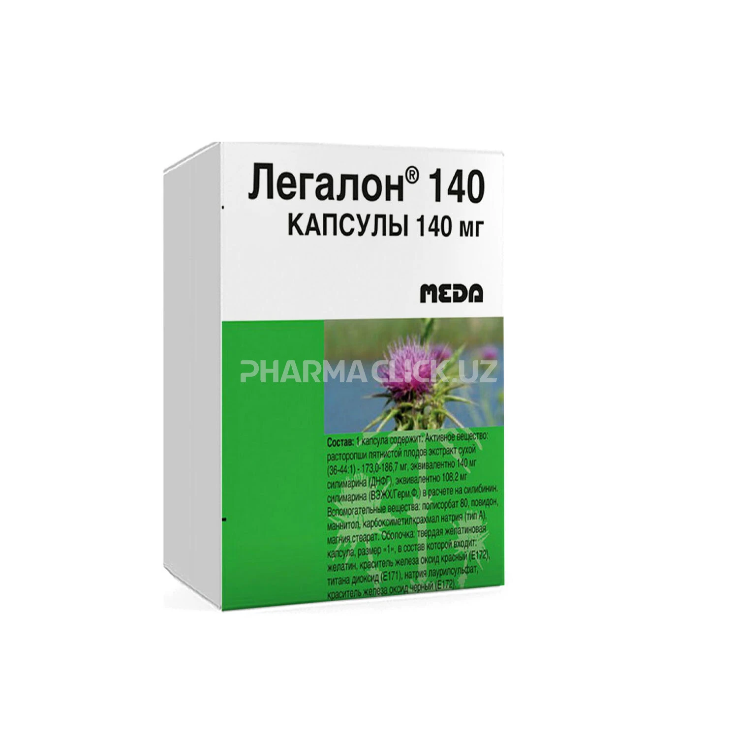 1 капсула (Легалон 140) содержит 173–188,7 мг сухого экстракта из плодов расторопши пятнистой, или 140 мг силимарина, рассчитанного из силибинина; в контурной ячейковой упаковке 10 шт., в картонной пачке 2 упаковки.