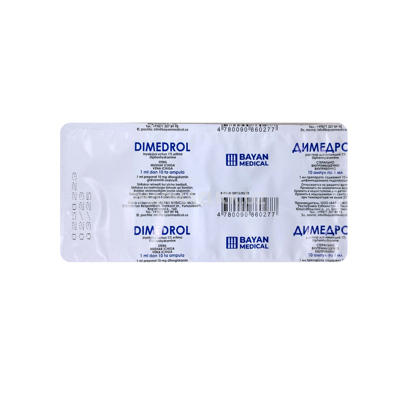 1 мл раствора содержит Активное вещество дифенгидрамина гидрохлорид -10мг Вспомогательное вещество вода для инъекций