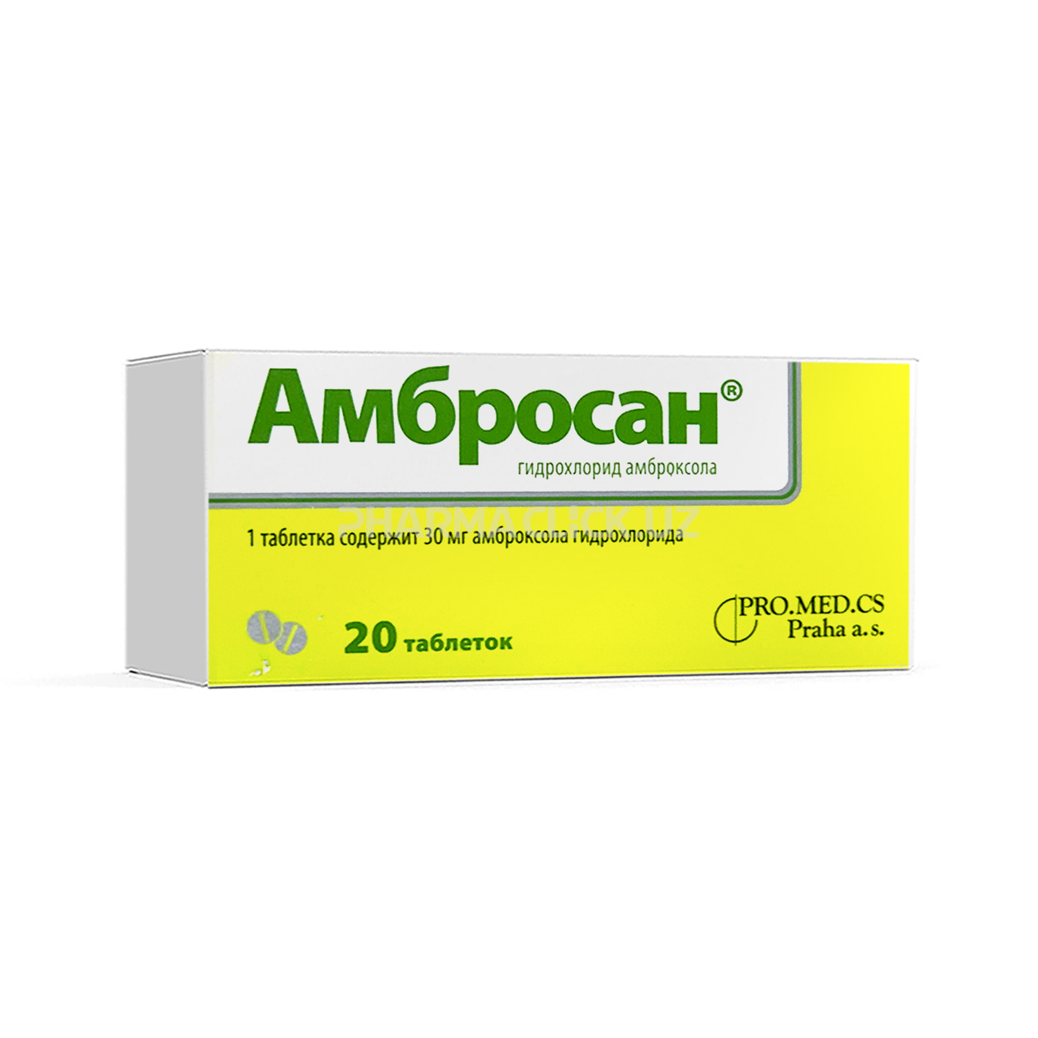 активное вещество Амброксола гидрохлорид (Ambroxoli hidrochloridum) 1 таблетка Амбросана содержит 30 мг амброксола гидрохлорида вспомогательные вещества моногидрат лактозы, микрокристаллическая целлюлоза, коповидон, стеарат магния.