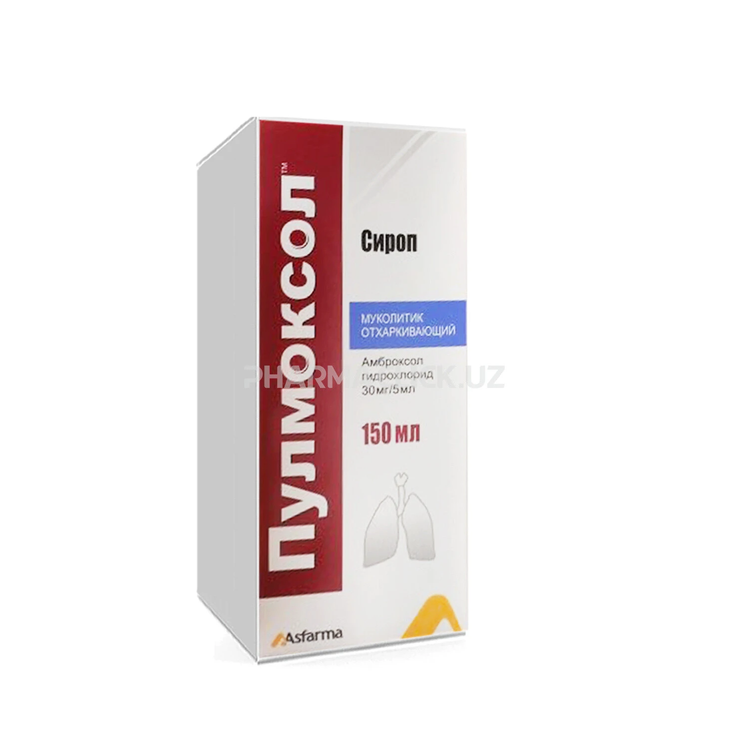 Пулмоксол педиатрический сироп 150 мл, 15 мг/5 мл, в темном стеклянном флаконе. 1 флакон мерная ложка 5 мл, калиброванная на 1/4 и 1/2 вместе с инструкцией, упакованные в картонную коробку.