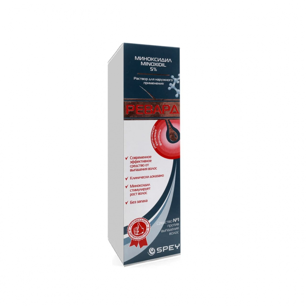 Препарат предназначен только для взрослых и только для наружного применения в области кожи головы. Перед применением препарата волосы и кожа головы должна быть тщательно высушены. Необходимо наносить на кожу головы по 1 мл (50 мг/мл) препарата Ревард (при нажатии спрея 6 раз) и втирать, начиная от центра пораженной области к периферии. Раствор должен быть распределен с помощью кончиков пальцев на всей пораженной части головы. Кратность применения – 2 раза в сутки, общая дневная доза не должна превышать 2 мл. Для более локализованного применения, необходимо установить аппликатор на верхней части распылительной головки. Рекомендуемую разовую дозу (1 мл) следует наносить независимо от размера пораженного участка. До и после нанесения препарата руки необходимо тщательно промыть.