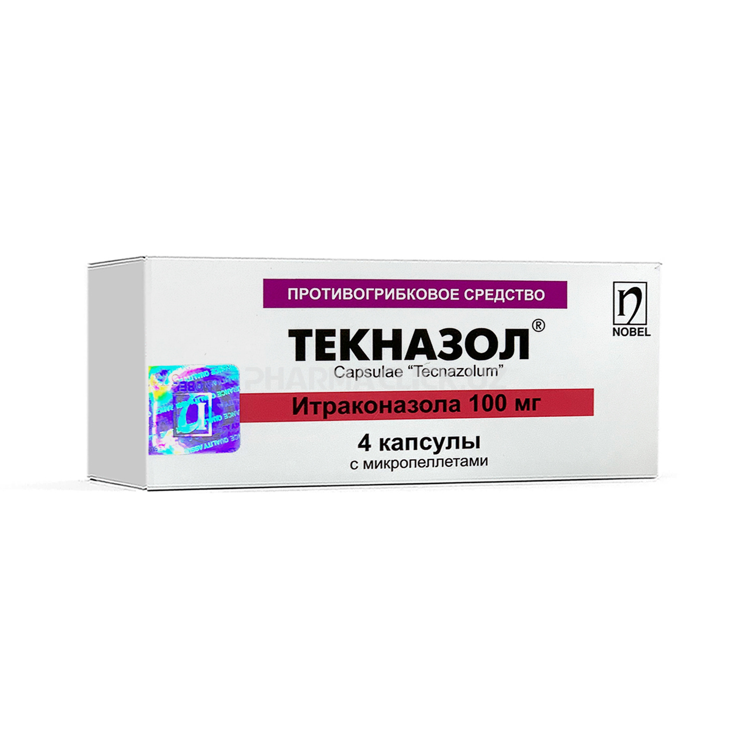 После приема внутрь абсолютная биодоступность препарата Текназол® составляет около 55%. Максимальная биодоступность наблюдается при совместном приеме с пищей. При приеме двойной дозы препарата наблюдается повышение концентрации итраконазола в плазме крови в три раза. Текназол® главным образом метаболизируется в печени, основным метаболитом является гидроксиитраконазол. Текназол® связывается с белками плазмы крови на 99.8 %, а гидроксиитраконазол на 99.5 %. Текназол® распределяется в разных тканях организма. Концентрация итраконазола в легких, почках, печени, костной ткани, желудке, селезенке, скелетных мышцах в 2–3 раза превышает его концентрацию в плазме крови. Накопление его в коже в 4 раза превышает его уровень в плазме крови. Терапевтическая концентрация итраконазола в коже сохраняется на протяжении 2–4 нед. после окончания 4-недельного курса терапии. Терапевтическая концентрация итраконазола в кератине ногтей достигается через 1 нед от начала лечения и сохраняется на протяжении 6 мес. после завершения 3-месячного курса лечения. Терапевтические концентрации в тканях влагалища сохраняются на протяжении 2 дней после окончания 3-дневного курса лечения в дозе 200 мг/сут. и 3 дней после однодневного применения в дозе 200 мг 2 раза в сутки. Выделение также происходит с секретом сальных и потовых желез кожи. Экскреция исходного вещества с фекалиями варьирует между 3-18% от принятой дозы. Почечная экскреция неизмененного интроконазола составляет менее 0,03% от принятой дозы. Около 40% от принятой дозы выводится в качестве неактивных метаболитов с мочой. Влияние на концентрацию итраконазола в плазме крови при печеночной недостаточности не установлено. В связи с этим, пациенты с печеночной недостаточностью должны находиться под тщательным наблюдением в случае применения итраконазола.