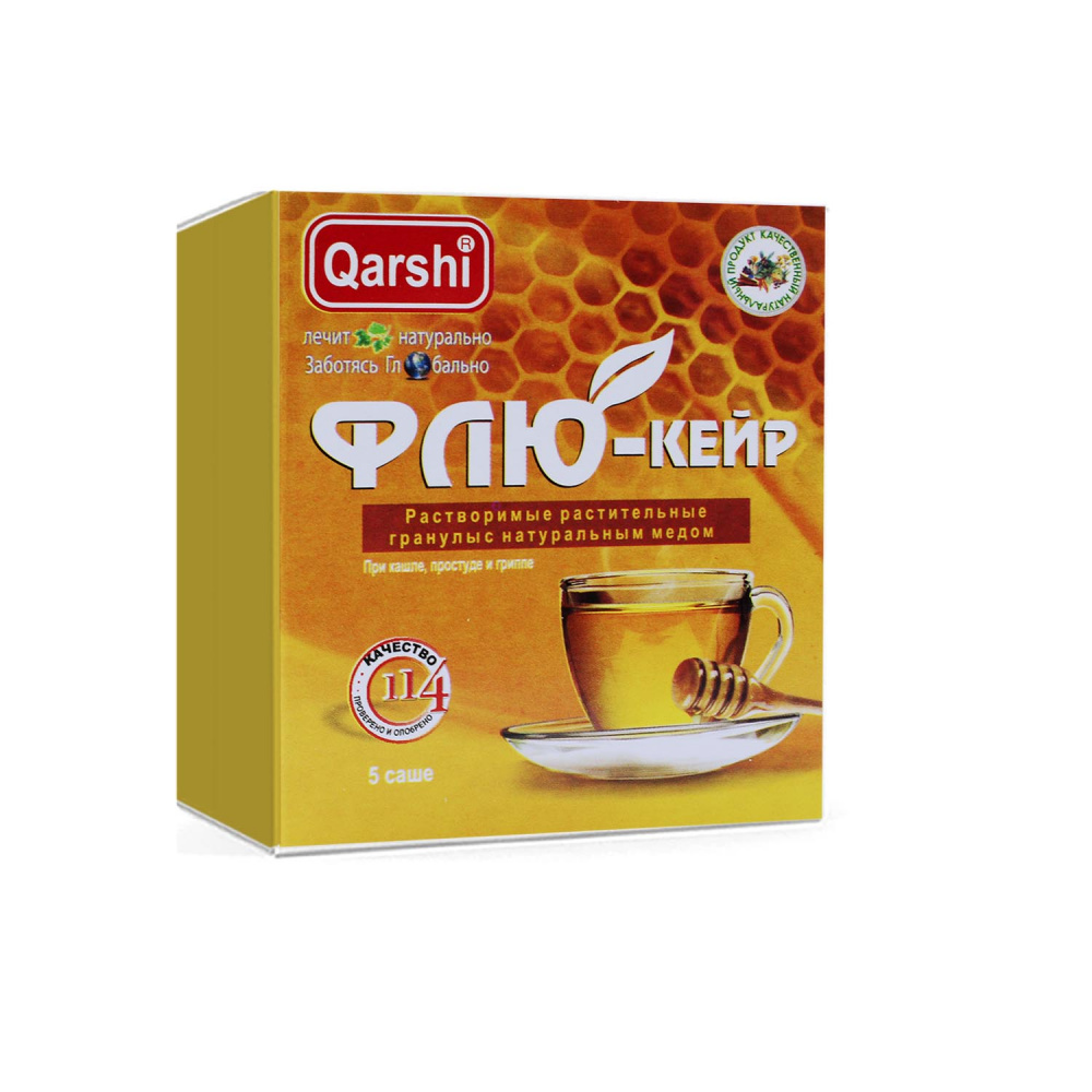 Флю-Кейр растворимый растительный чай, состоящий из тщательно подобранной смеси лекарственных растений, предназначенных для лечения простуды и симптомов гриппа, таких как раздражение в горле, кашель, насморк и др. Солодка голая (Glycyrrhiza glabra Ext.) – оказывает смягчающее, охлаждающее, отхаркивающее, антиастматическое и противокашлевое действие. Иссоп лекарственный (Hyssopus officinalis) – оказывает противофлегматическое, отхаркивающее действие. Используется для лечения больного горла и катаральных инфекций. Адатода сосудистая (Adhatoda vasika) – бронходилататор, отхаркивающее средство и муколитик. Нормализует функцию легких. Чай китайский (Thea sinensis) – мощное антиоксидантное средство, противобактериальное, среднее обезболивающее и вяжущее средство. Мята перечная (Mentha piperita Ext.) – отхаркивающее, охлаждающее, ароматизирующее, местное антисептическое и обезболивающее средство. Фенхель обыкновенный (Foeniculum vulgare Oil) – оказывает отхаркивающее, противовоспалительное и стимулирующее действие. Эвкалипт шаровидный (Eucalyptus globules Oil) – противовоспалительное и противоотечное средство. Проявляет антибактериальное действие на патогенные бактерии дыхательных путей.