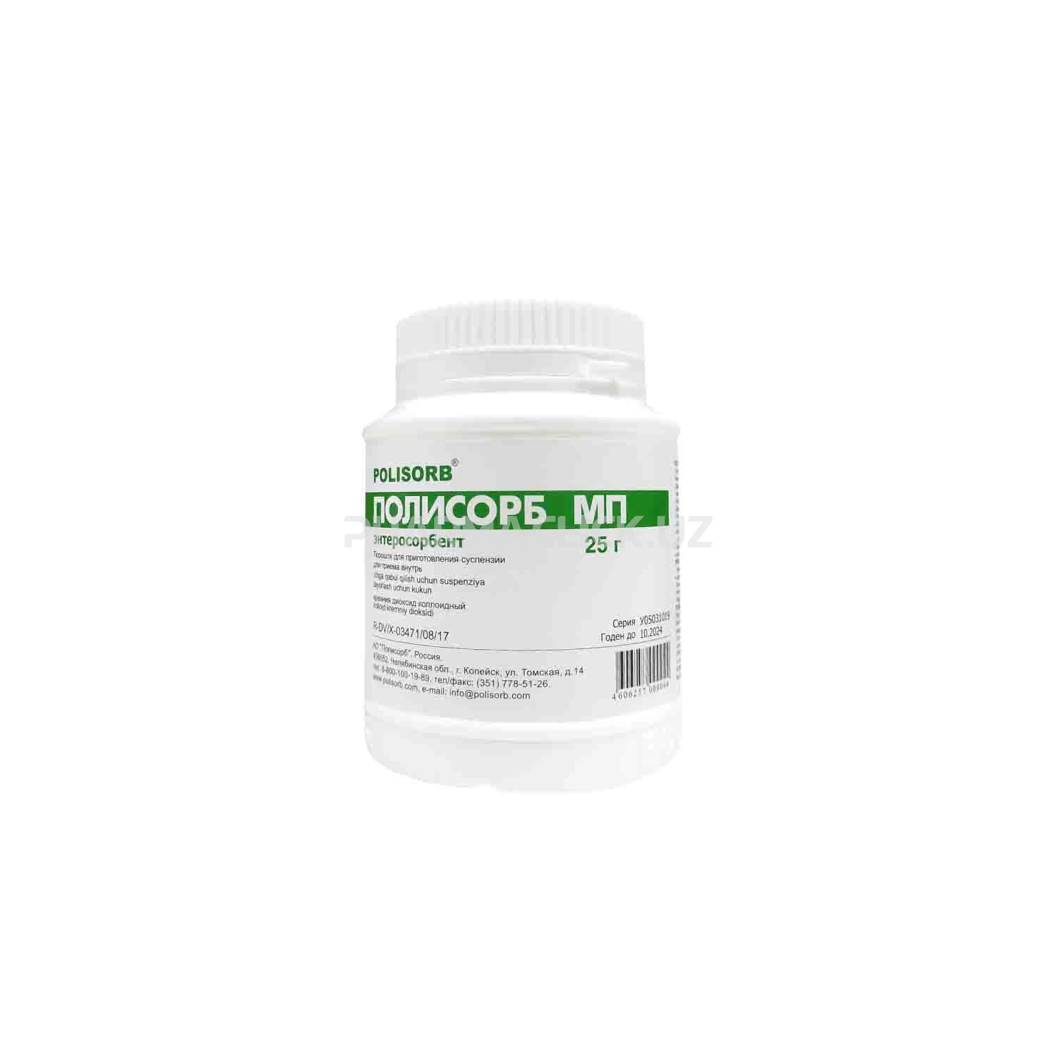 Полисорб МП — неорганический, неселективный, полифункциональный энтеросорбент на основе высокодисперсного кремнезема с размерами частиц до 0,09 мм, с химической формулой SiO2. Удельная площадь поверхности препарата порядка 300 м2/г. Емкость адсорбции препарата при внутреннем употреблении не менее 220 мг/г.
