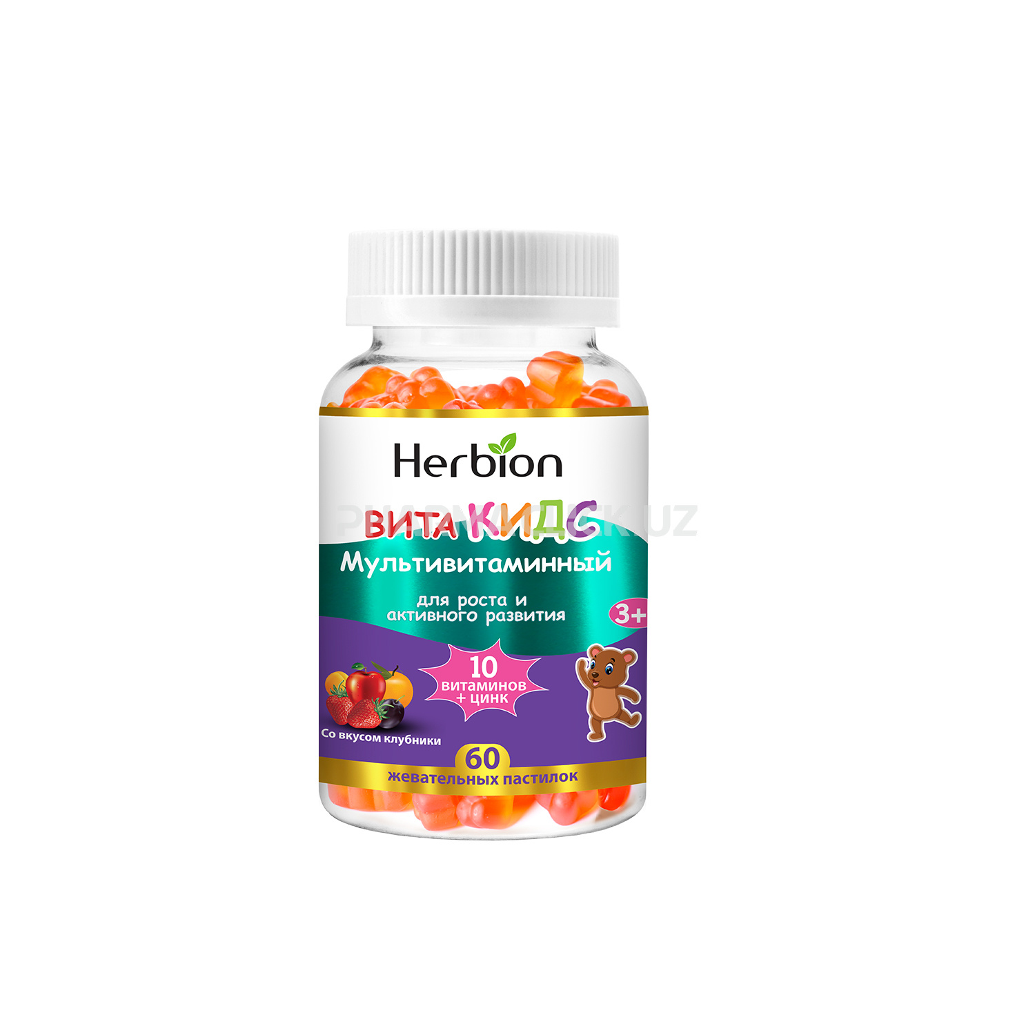 сироп глюкозы, сахар, глюкоза, сок концентрированный яблочный, пектин, лимонная кислота (регулятор кислотности), цитрат натрия, аскорбиновая кислота (витамин С), Альфа-токоферола ацетат (витамин Е), натуральный ароматизатор “Клубника”, глазирователь (растительное масло, карнаубский воск), пантотеновая кислота, концентрированный сок фиолетовой моркови (краситель), цитрат цинка, ретинола ацетат (витамин А), пиридоксина гидрохлорид (витамин В 6), фолиевая кислота, биотин, калия иодид, инозит, холин, ционокобаламин, (витамин В 12) холекальциферон (витамин Д3).