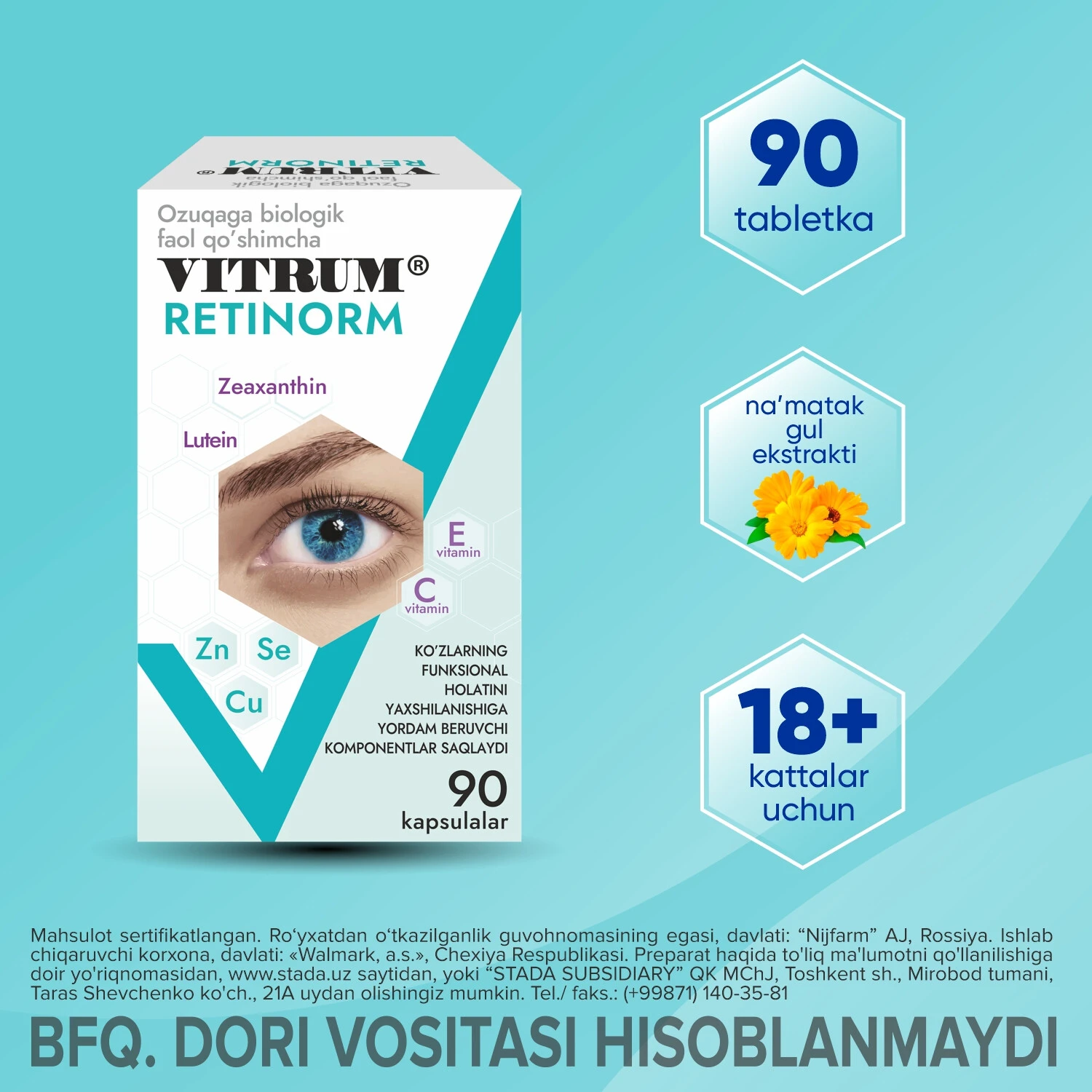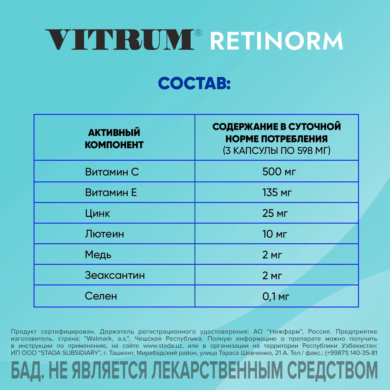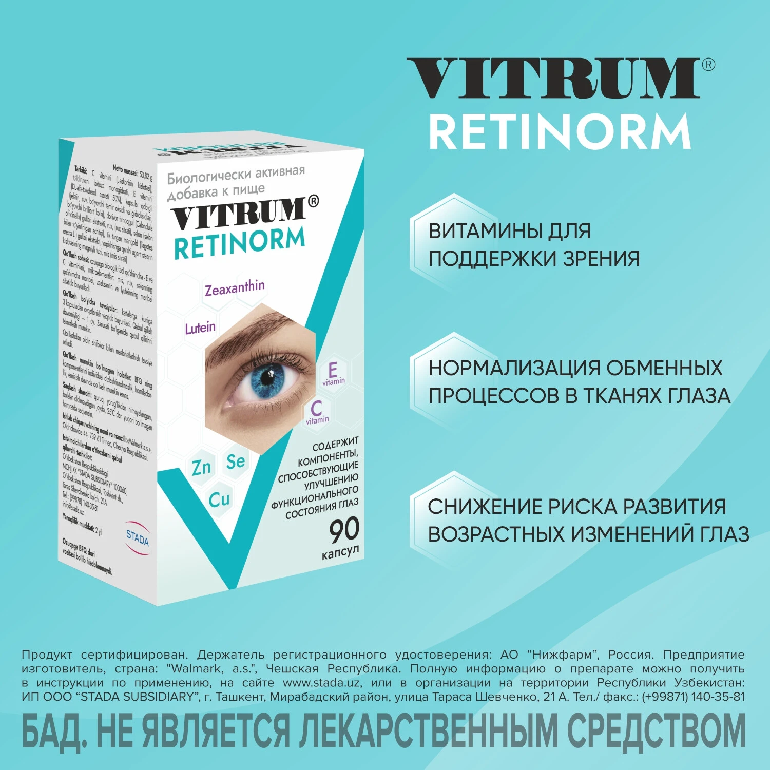 ВИТРУМ РЕТИНОРМ (VITRUM RETINORM) - Биологически активная добавка (БАД) к пище - входящие в состав БАД лютеин, зеаксантин, витамины С, Е и микроэлементы способствуют нормализации обменных процессов в тканях глаза, могут способствовать снижению риска развития возрастных изменений глаз.