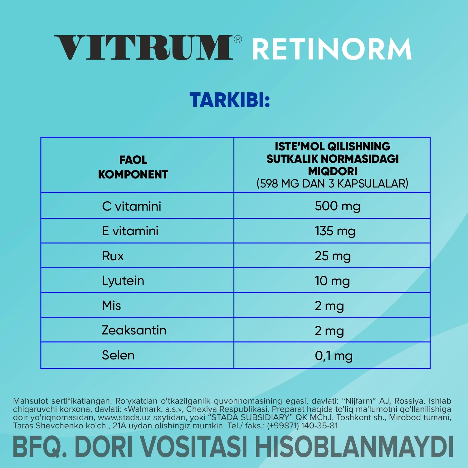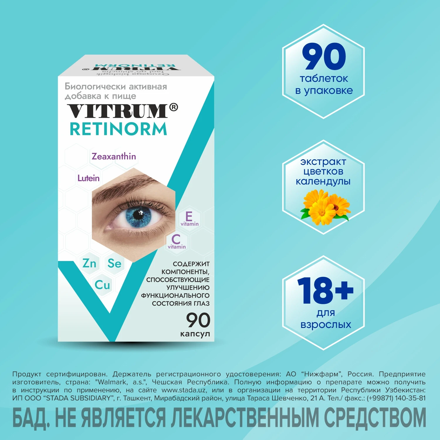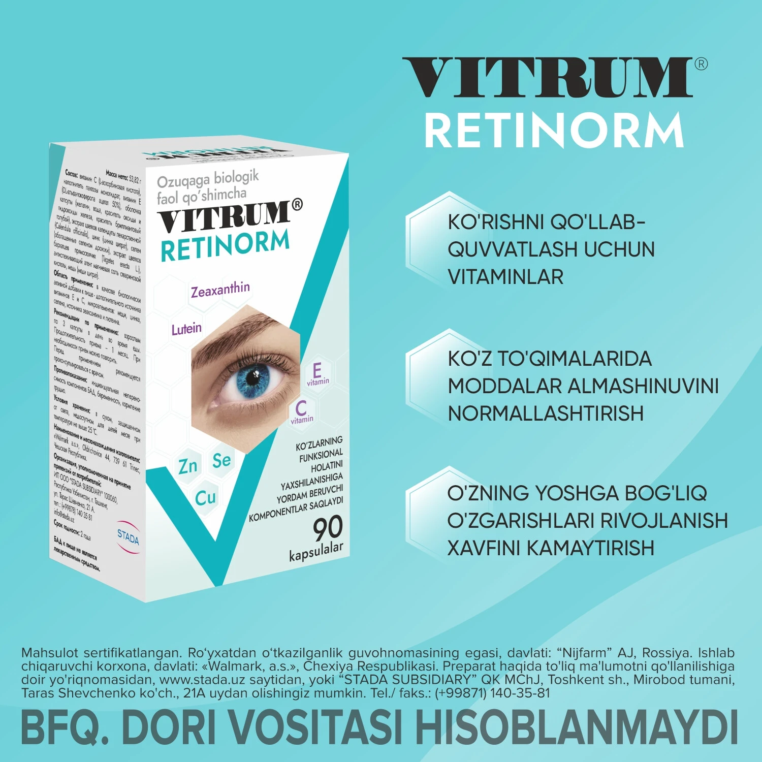 ВИТРУМ РЕТИНОРМ (VITRUM RETINORM) - Биологически активная добавка (БАД) к пище - входящие в состав БАД лютеин, зеаксантин, витамины С, Е и микроэлементы способствуют нормализации обменных процессов в тканях глаза, могут способствовать снижению риска развития возрастных изменений глаз.