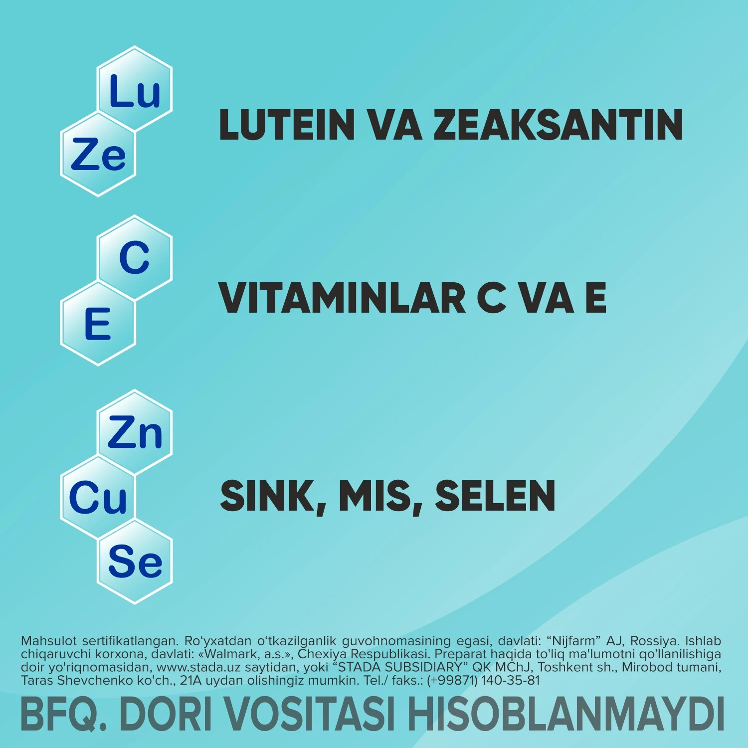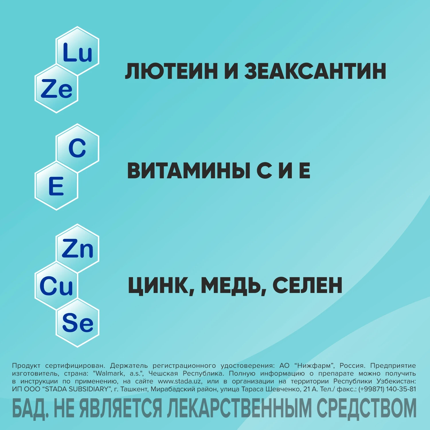 витамин С (L-аскорбиновая кислота), наполнитель лактозы моногидрат, витамин E (DL-альфа-токоферола ацетат 50%), оболочка капсулы (желатин, вода, краситель оксиды и гидроксиды железа, краситель бриллиантовый голубой), экстракт цветков календулы лекарственной (Calendula officinalis), цинк (цинка цитрат), селен (обогащенные селеном дрожжи), экстракт цветков бархатцев прямостоячих (Tagetes erecta L.), антислеживающий агент магниевая соль стеариновой кислоты, медь (меди цитрат).