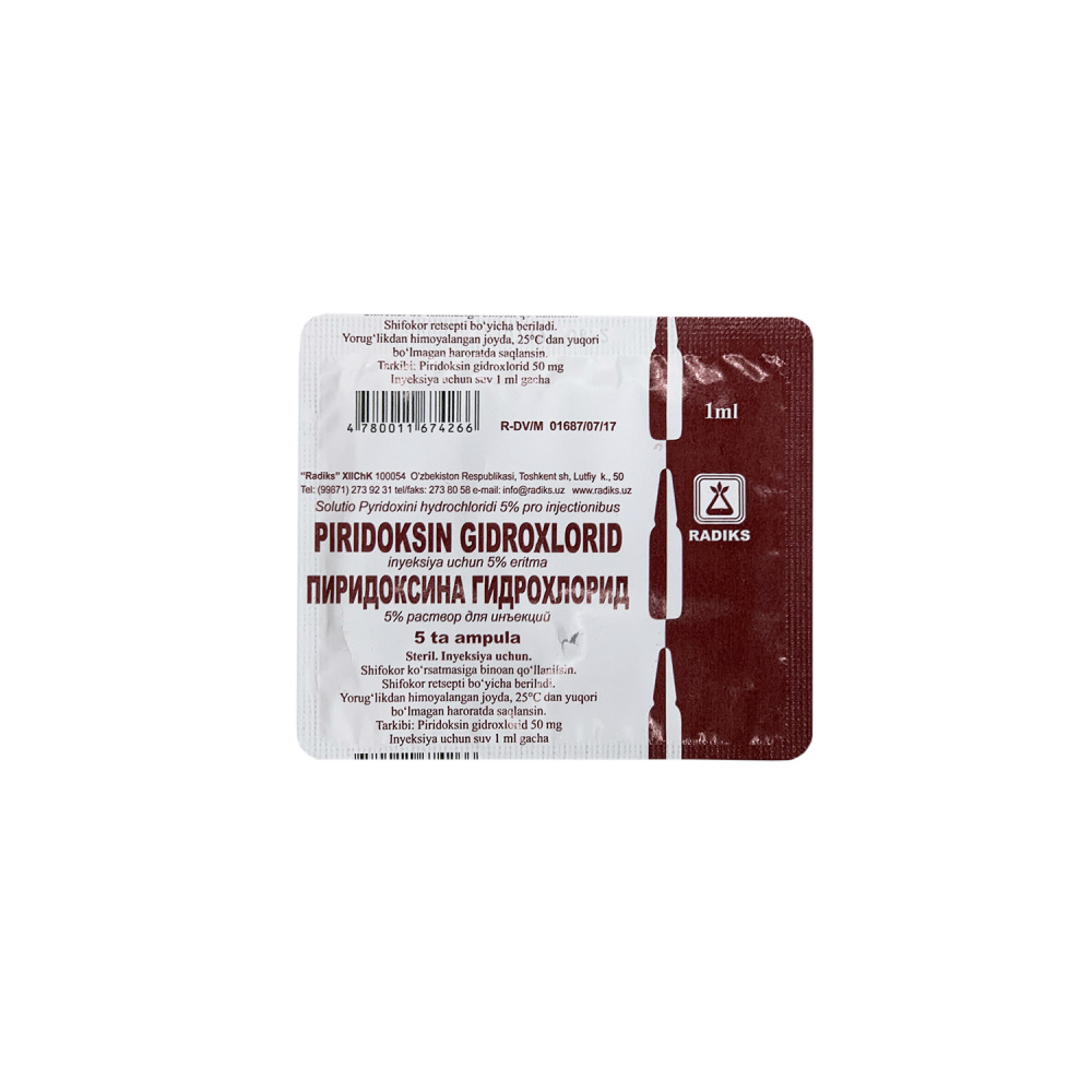 Инструкция Пиридоксина гидрохлорид (Вит В6) р-р д/ин. 5% 1мл №5 (Radiks)