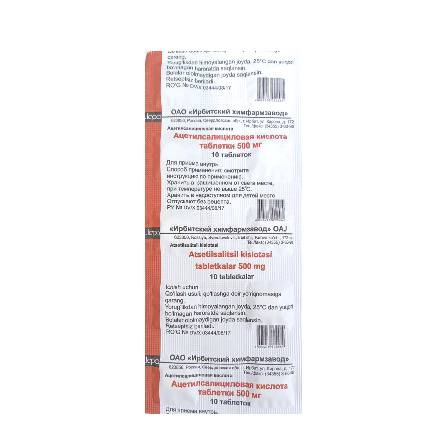 Atsetilsalitsilovaya kislota tabletkalar 500mg №10 Irbit