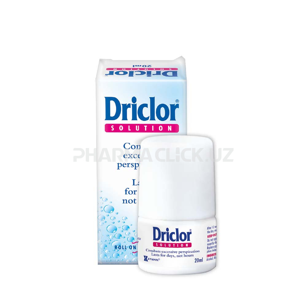 Driclor Solution kuchli terlash yoki giperhidrozni davolash uchun ishlab chiqilgan. U ta'sirlangan ter bezlarida jel matritsasini hosil qilish orqali ishlaydi, bu sizning tanangizdagi ter oqimini kamaytiradi va to'xtatadi. Ortiqcha ter tanaga qayta so'riladi va odatdagidek yo'q qilinadi. U qo'llar, oyoqlar va qo'ltiqlarda ishlaydi, ortiqcha terlashga eng zaif bo'lgan ba'zi joylarga ta'sir qiladi. Faol modda alyuminiy xloriddir. Driclor Solution-dan bir necha hafta o'tgach, ortiqcha terlash susayishi kerak va bemorlar salqin, quruq va yangi his qilishlari kerak.