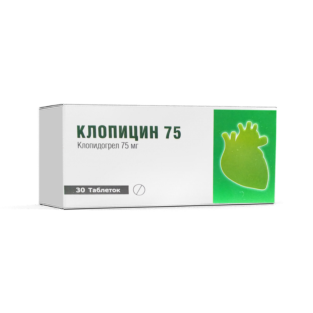 Клопицин-75 Таблетки предназначен для снижения риска атеросклеротических осложнений (инфаркт миокарда, инсульт, смерть по причине сосудистого заболевания) у больных атеросклерозом, которые недавно перенесли инсульт, инфаркт миокарда или которые страдают диагностированным заболеванием периферических артерий. Способ применения Взрослые и больные пожилого возраста. Препарат назначают по 75 мг 1 раз в сутки, независимо от приёма пищи. У больных с острым коронарным синдромом без подъёма сегмента ST (нестабильная стенокардия или инфаркт миокарда без зубца Q на ЭКГ) лечение клопидогрелем начинают с одноразовой нагрузочной дозы 300 мг, а потом продолжают в дозе 75 мг 1 раз в сутки (с ацетилсалициловой кислотой (АСК) в дозе 75-325 мг в сутки). Поскольку применение более высоких доз АСК повышает риск кровотечений, рекомендуется не превышать дозу ацетилсалициловой кислоты 100 мг. Оптимальная длительность лечения формально не установлена. Результаты клинических исследований свидетельствуют в пользу применения препарата до 12 месяцев, а максимальный эффект наблюдался через 3 месяца лечения. У больных с острым инфарктом миокарда с подъёмом сегмента ST клопидогрел назначают по 75 мг 1 раз в сутки, начиная с одноразовой нагрузочной дозы 300 мг в комбинации с АСК, с применением тромболитических препаратов или без них. Лечение больных старше 75 лет начинают без нагрузочной дозы клопидогреля. Комбинированную терапию следует начинать как можно раньше после появлений симптомов и продолжать четыре недели. Польза от применения комбинации клопидогреля с АСК более четырех недель при этом заболевании не изучалась, поэтому таким пациентам препарат следует назначать с осторожностью.