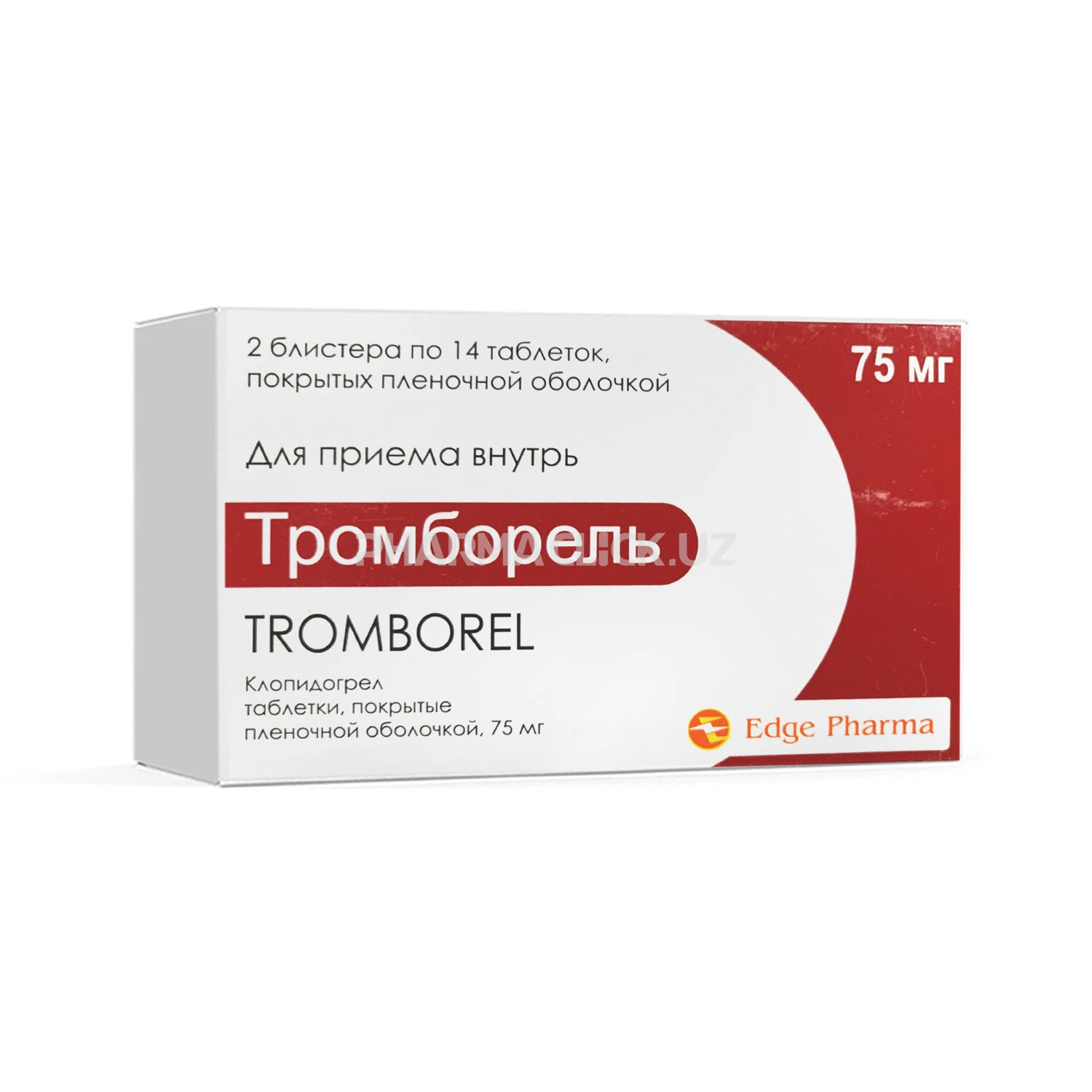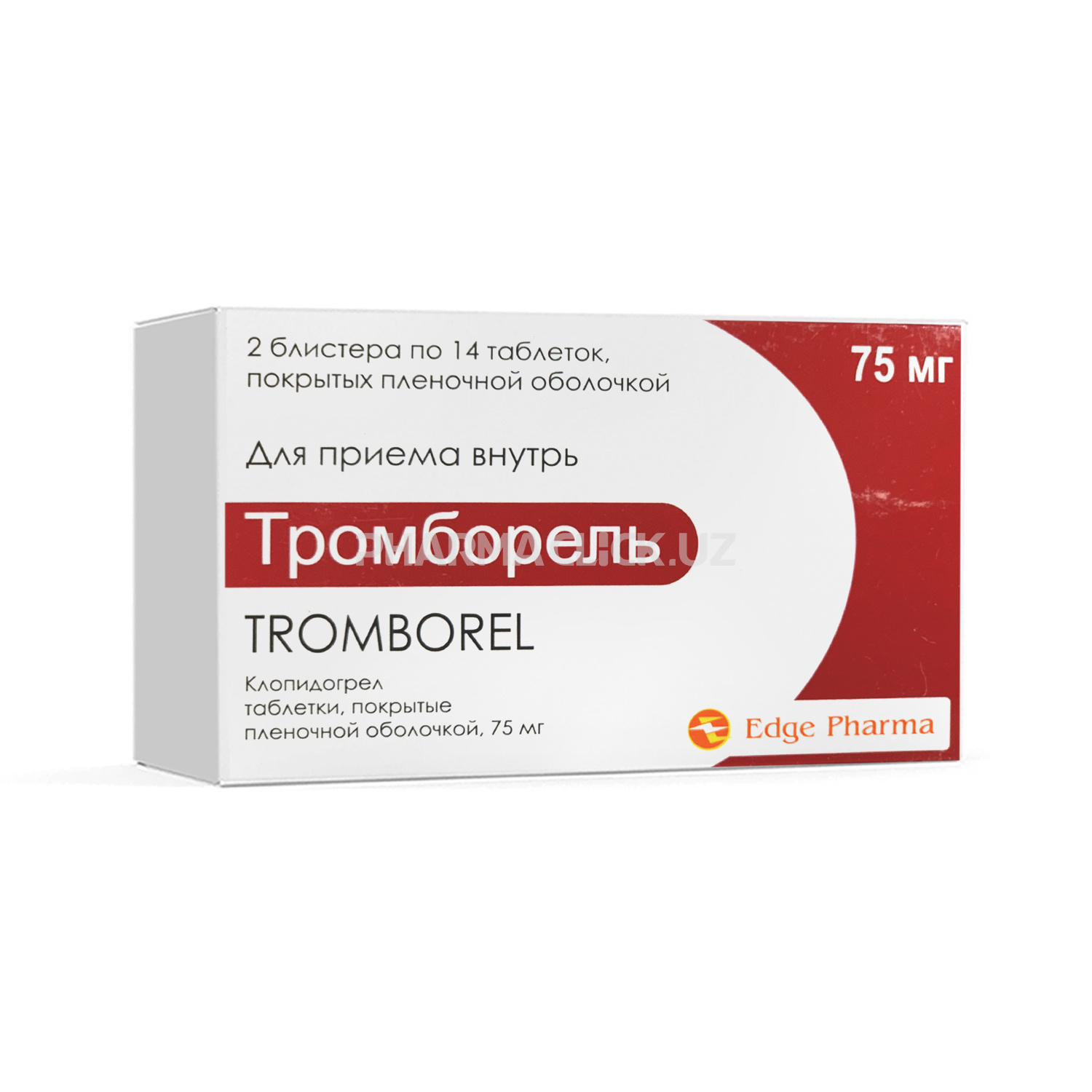 Tromborelning dozasini oshirib yuborilishi qon ketish vaqtini cho‘zilishi va keyingi asoratlariga olib kelishi mumkin. Qon ketishi aniqlanganida muvofiq davolash qo‘llanishi kerak. Klopidogrelning farmatsevtik faolligini antidotlari aniqlanmagan. Agar qon ketishning cho‘zilgan vaqtini tez to‘g‘rilashning zarurati bo‘lsa, trombotsitar massani quyish tavsiya qilinadi. Chiqarilishi shakli Plyonka qobiq bilan qoplangan tabletkalar, 75 mg. Plyonka qobiq bilan qoplangan 14 tabletkadan Al/PVX yoki Al/Al blisterda. 2 blisterdan tibbiyotda qo‘llash bo‘yicha yo‘riqnomasi bilan birga karton qutiga joylangan.