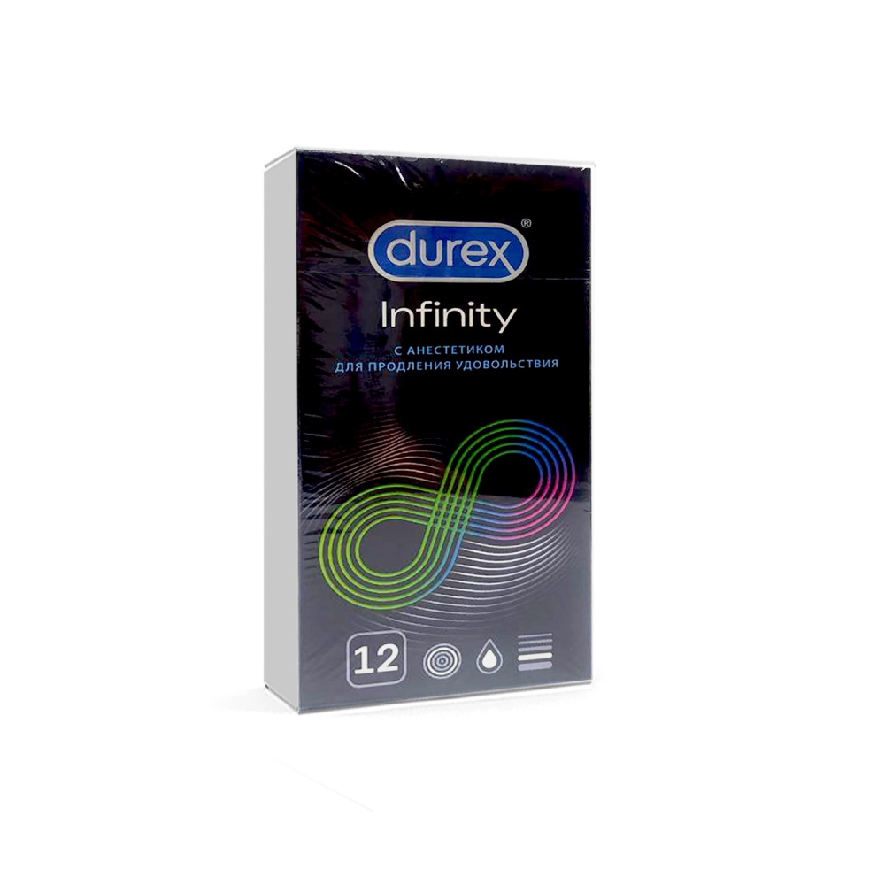 Jinsiy aloqani uzaytirish, shuningdek, erta eyakulyatsiyaning oldini olish uchun Durex Infinity prezervativlari. Durex Infinity prezervativlari prezervativ ichida anestetik (benzokayin) qo‘shilgan moy va tashqi tomondan oddiy silikon moyni o‘z ichiga oladi. Jinsiy aloqani uzaytirish, shuningdek, erta eyakulyatsiyaning oldini olish uchun. Ishlab chiqarish texnologiyasi tufayli ular yoqimsiz hidga ega emas. Dam olishingiz va xavfsiz jinsiy aloqadan bahramand bo‘lishingiz uchun hamma narsa ko‘zda tutilgan. Nominal o‘lchamlari uzunligi - 195 mm, eni - 56 mm. Moyli shaffof prezervativlar, to‘plagichli maxsus forma. "Easy on" maxsus anatomik shakli.