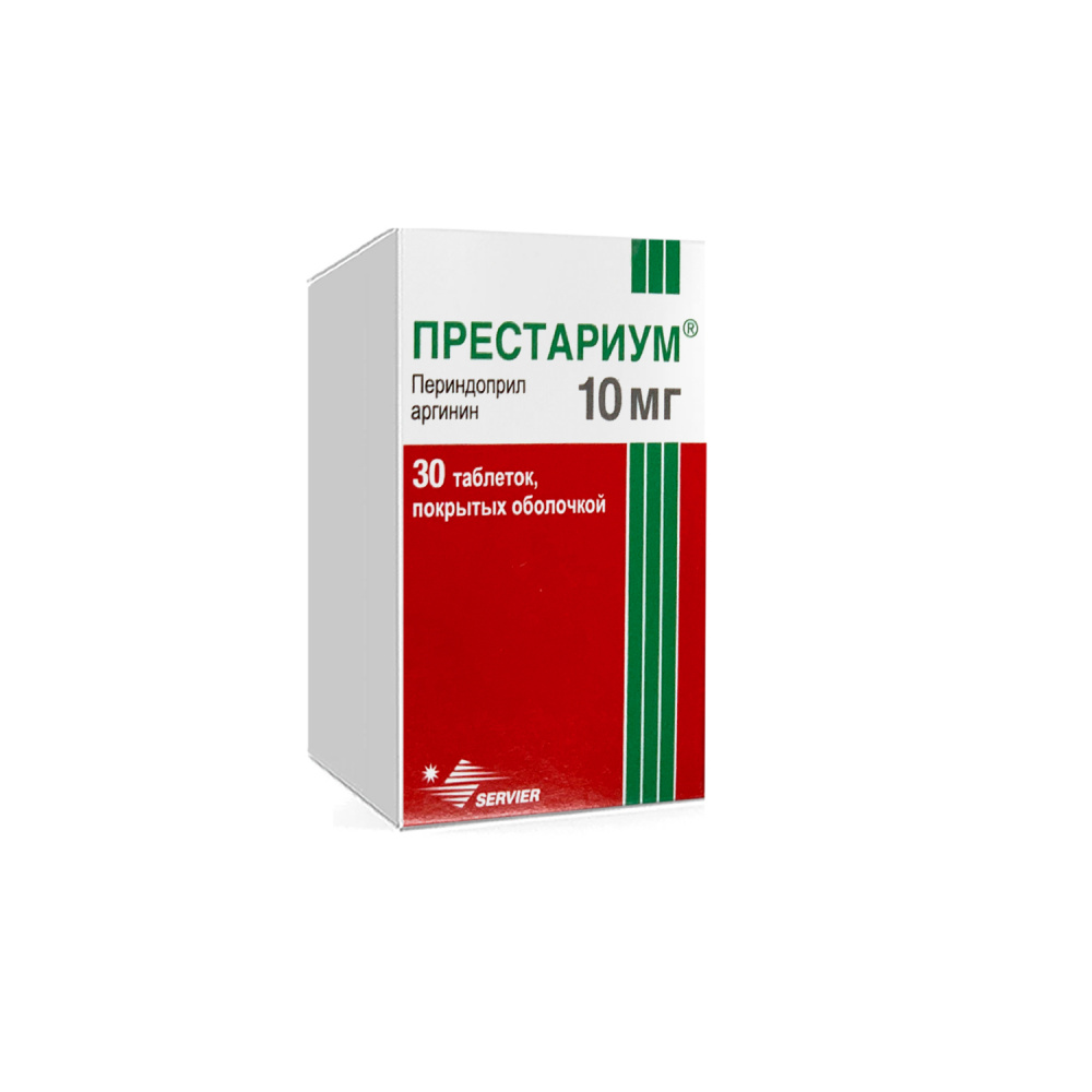 PRESTARIUM 10 mg - yashil rangli, ikki yoqlama qavariq, plyonka qobiq bilan qoplangan, bir tomonida belgi va boshqa tomonida bosib tushirilgan tabletkalar. Tabetkalar 30 tabletka saqlovchi butilkalarda chiqariladi.