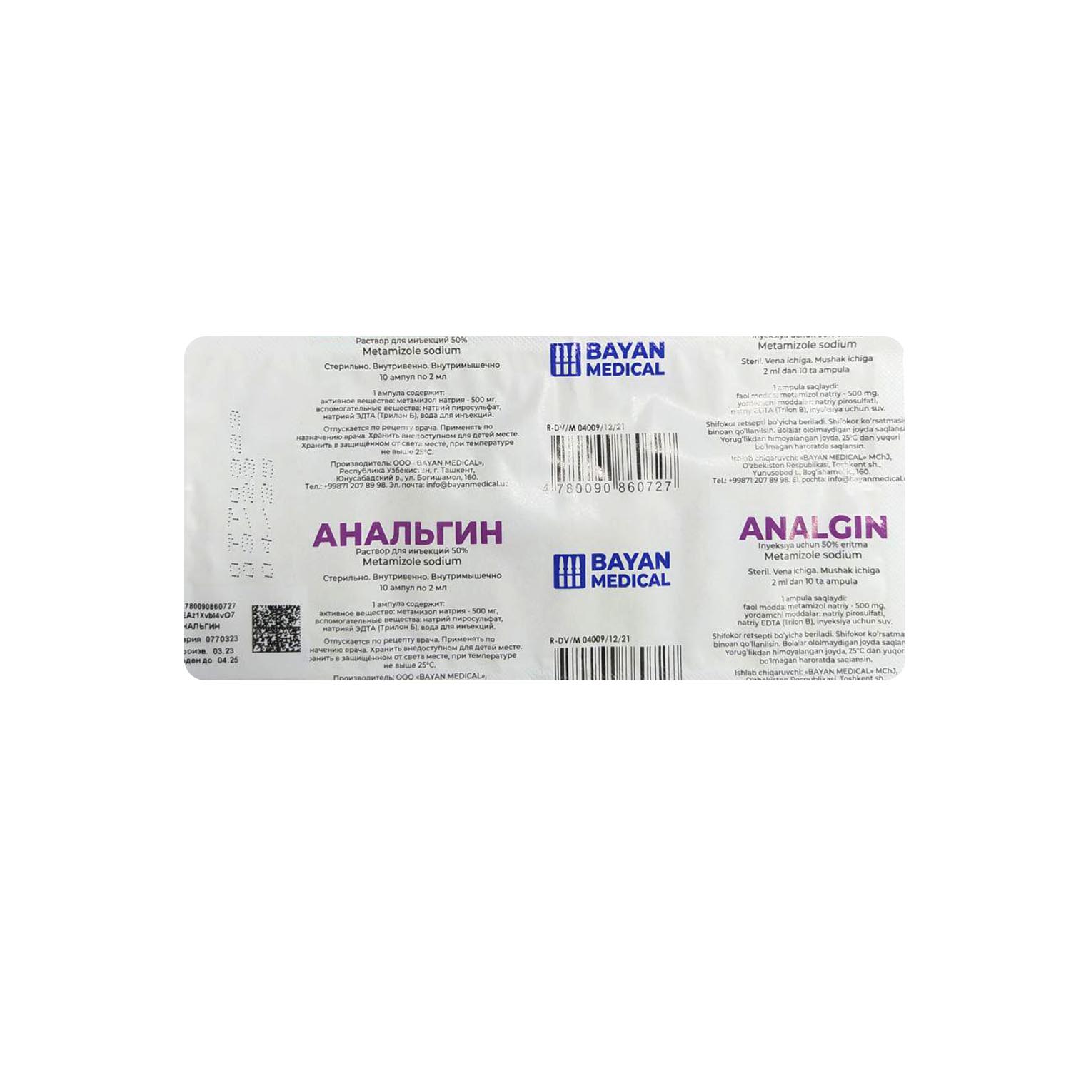 Analgin in'ektsiya uchun eritma 50% 2ml №10 (BAYAN MEDICAL)