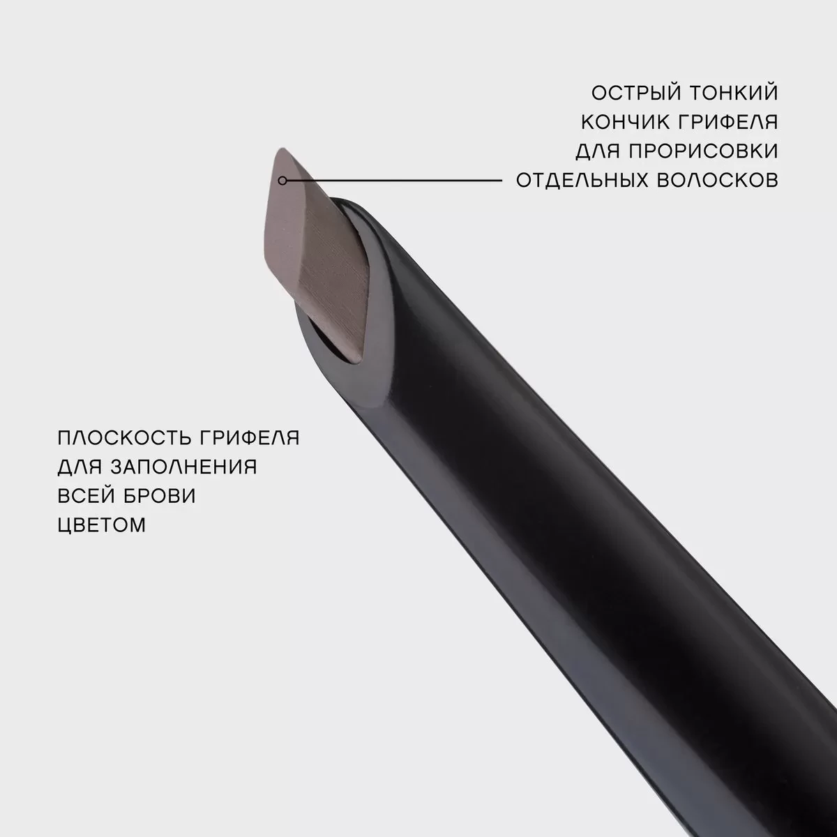 Qalamning o‘ziga hosligi - bu ikki tomonlama tig‘ shaklidagi ultra tekis egilgan sterjen bo‘lib, undan bir vaqtning o‘zida ikki xil usulda foydalanish mumkin. Agar alohida sochlarni chizish va tabiiiy ko'rinish berish kerak bo'lsa, qalamning o'tkir uchidan foydalaning. Agar chiroyli chiziqlar yaratib, rang bilan to'ldirish kerak bo'lsa, qalamning tekis tomonidan foydalaning. Tabiiy mum asosidagi formula teksturaning uzoq davomiyligini ta'minlaydi.