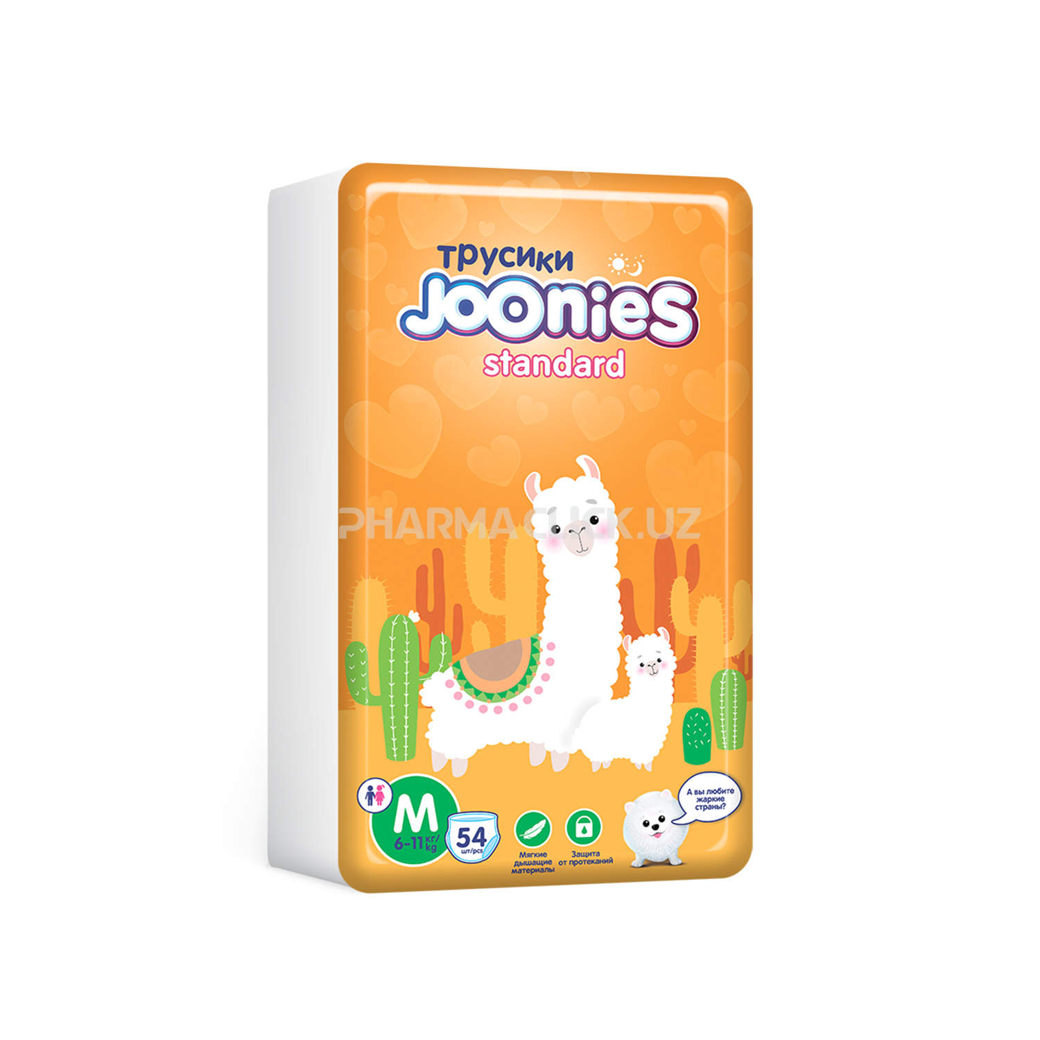 "Подгузники-трусики Standard – это новая линейка трусиков от торговой марки Joonies для активных малышей. Стильный дизайн подгузников Standart порадует не только маму, но и малыша. Милые мордочки зверят изображены не только на пачке, но и на самих трусиках. Трусики тонкие и приятные к телу, совсем как обычные хлопковые трусишки. Внутренняя рифленая поверхность защищает малыша от раздражений. Впитывающий слой состоит из двухслойного суперабсорбента, который надежно удерживает влагу внутри подгузника. Полоски-индикаторы сменят цвет и подскажут, когда пора сменить подгузник.