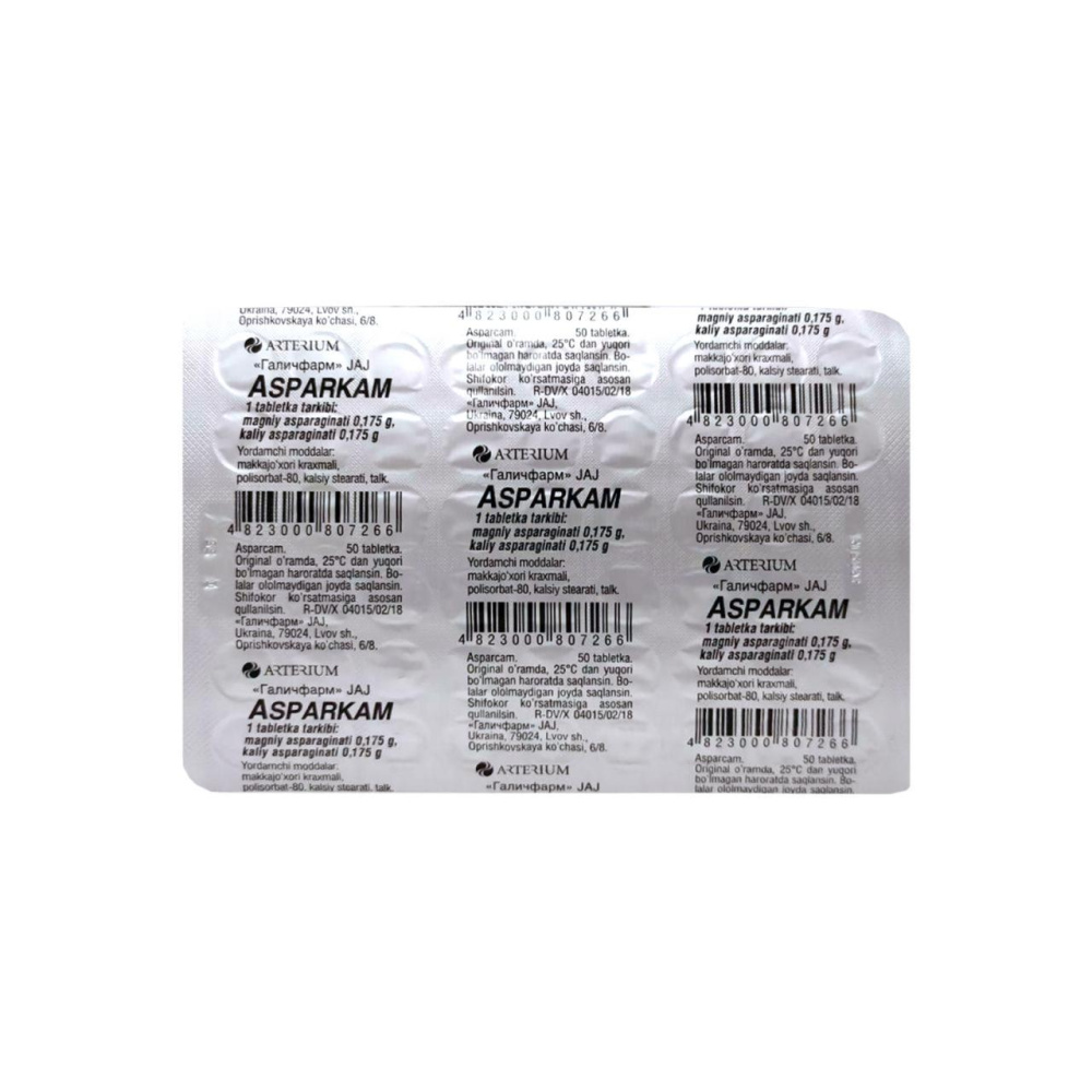 В связи с наличием в составе препарата ионов калия при применении Аспаркама с калийсберегающими диуретиками, ингибиторами АПФ, бета-адреноблокаторами, циклоспорином повышается риск развития гиперкалиемии (необходим контроль уровня калия в плазме крови) и усиливается угнетающее влияние на перистальтику кишечника. Препарат тормозит всасывание пероральных форм тетрациклина, солей железа и фторида натрия (необходимо придерживаться трёх часового интервала между приемами). Аспаркам усиливает эффект лекарственных средств, которые стимулируют трофические процессы в миокарде; предотвращает развитие гипокалиемии, обусловленной применением салуретиков, кортикостероидов, сердечных гликозидов. Аспаркам уменьшает кардиотоксическое действие сердечных гликозидов. При одновременном применении с антидеполяризующими миорелаксантами усиливается нервно-мышечная блокада, со средствами для наркоза (кетамин, гексанал, фторотан и др.) – угнетается центральная нервная система. Аспаркам может снижать эффективность неомицина, полимиксина В, тетрациклина и стрептомицина.