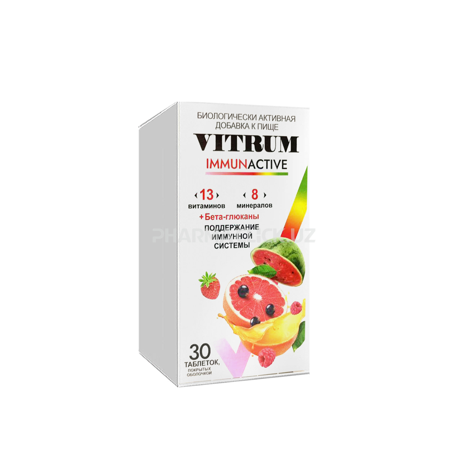VITRUM IMMUNACTIVE vitamin-mineral majmuasi 13 vitaminlar va 8 minerallar, shuningdek beta-glyukanlar va bioflavonoid majmualarini – immunitetni tutib turish uchun sinergik ishlaydigan zarur komponentlarni saqlaydi