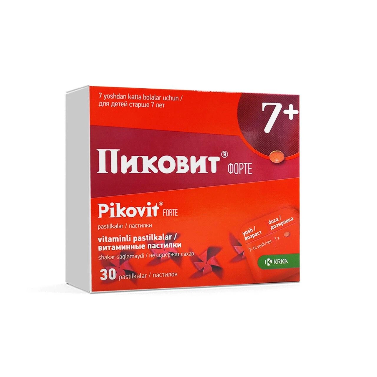 Pikovit® forte pastilkalari 7 yosh va undan katta bolalar uchun tavsiya etilgan kunlik dozaga mos keladigan miqdorda 11 ta eng muhim vitaminlarni o‘z ichiga oladi.