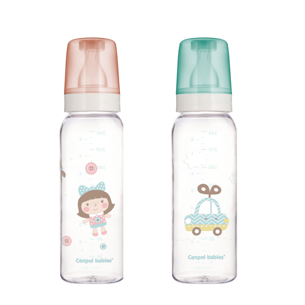 Canpol Babies oziqlantiruvchi shishasi temperli, bardoshli, xavfsiz shishadan tayyorlangan.